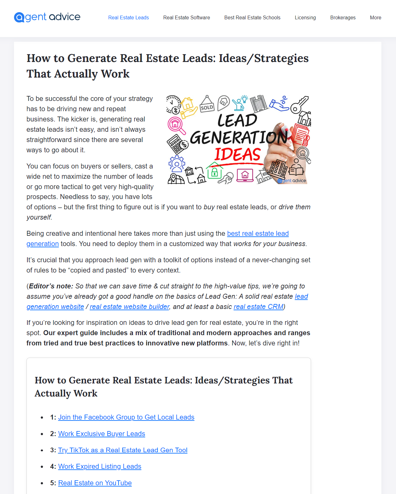 AgentAdvice uses how-to articles, listicles, and reviews to generate qualified prospects for its website