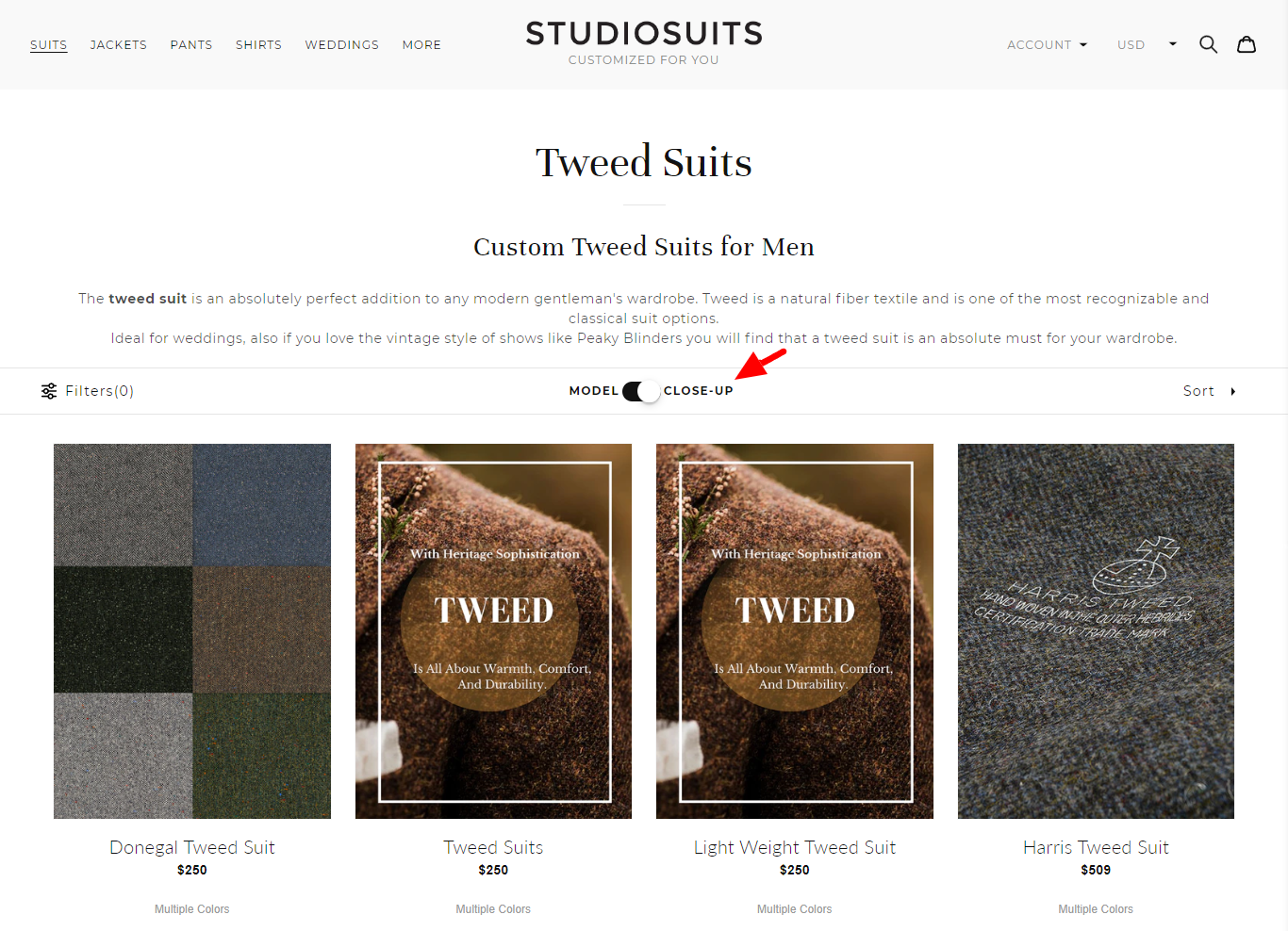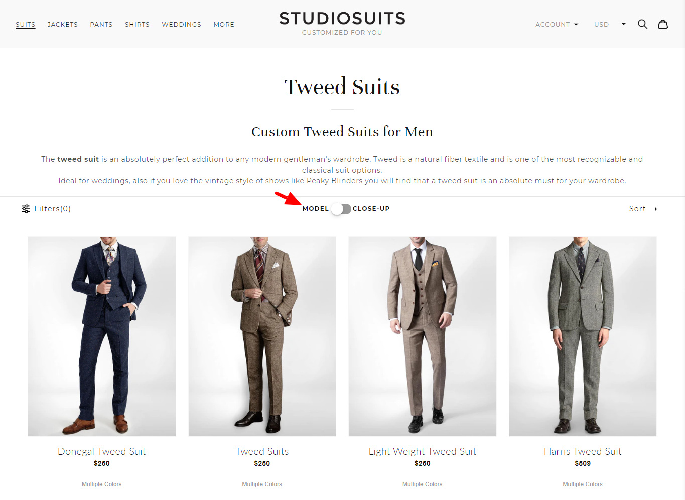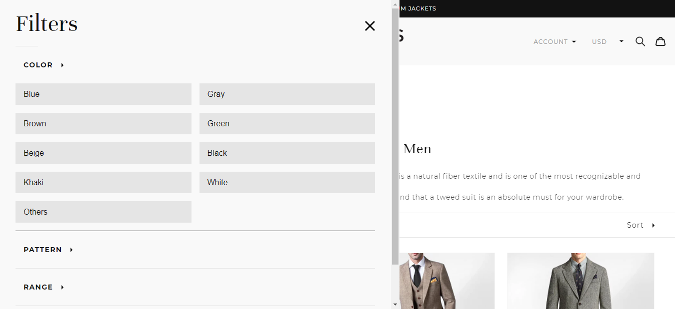 The fashion brand, specializing in made-to-order stunning suits, uses dedicated product pages with smart filters that make shopping feel like a personalized, in-store experience.