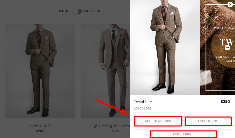 Doing so also pulls up another interactive content window, where the shopper can enter their measurements, size, and fabric choice:
