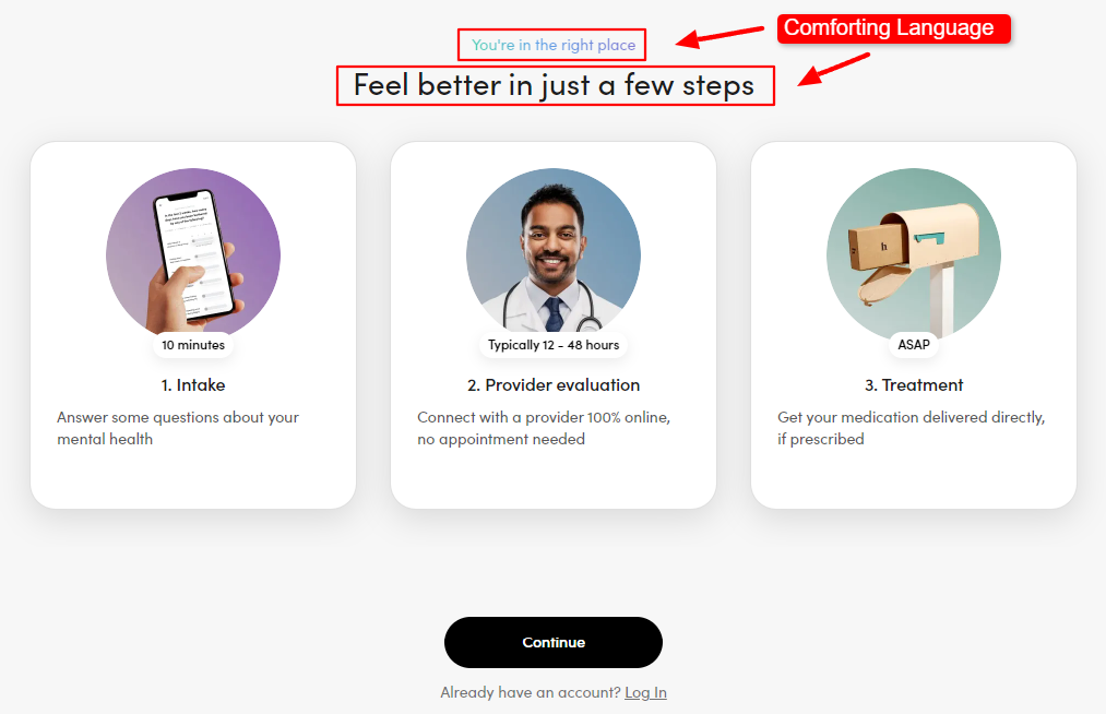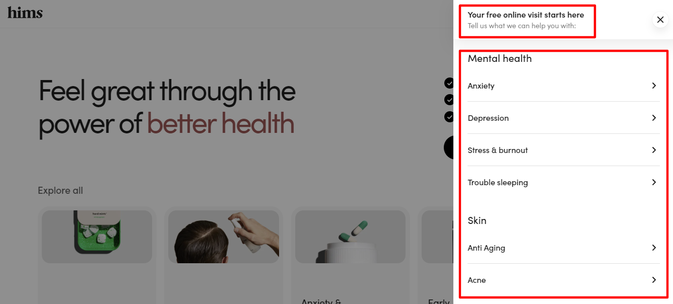 For instance, if the visitor chooses a mental health concern, the brand uses comforting language to help them feel seen and understood.