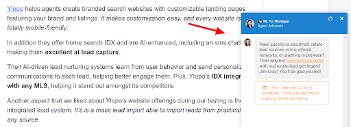 After a user is on-page long enough, AgentAdvice generates an AI chatbox window to ask potential leads if they’d like to schedule a call.
