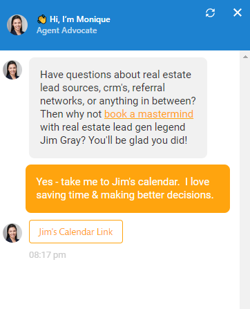 If the prospect says yes, the AI bot offers a link to the next available agent’s calendar: