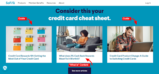 Get inspired by its credit card pillar page, packed with valuable assets, such as credit card reward guides, cash back definition articles, and product change guides: