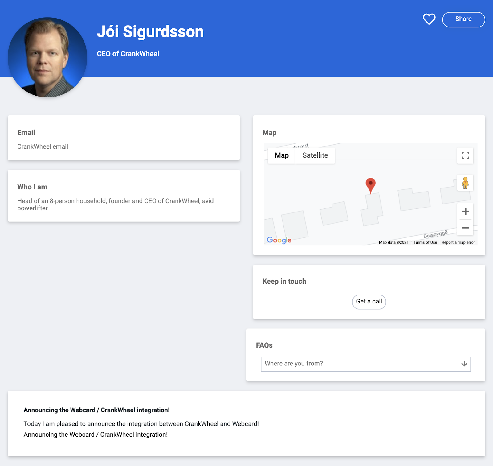 Let’s find out how a free Webcard will let you build an online presence in minutes, and how you can connect it with your CrankWheel account in a couple of easy steps so that your customers can request that you give them a call back and screen share with them.