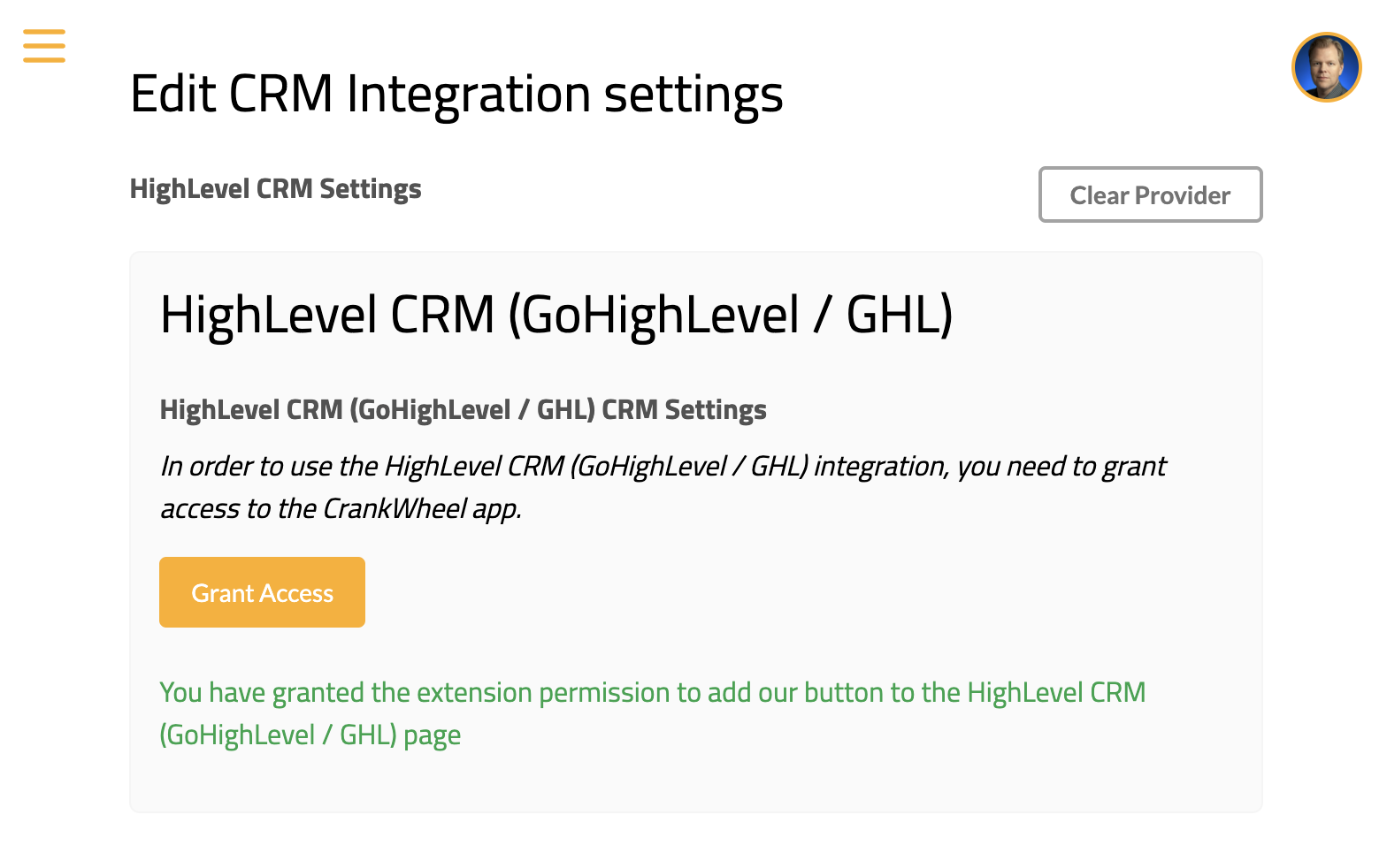 Step 1 - select HighLevel as the CRM provider for CrankWheel