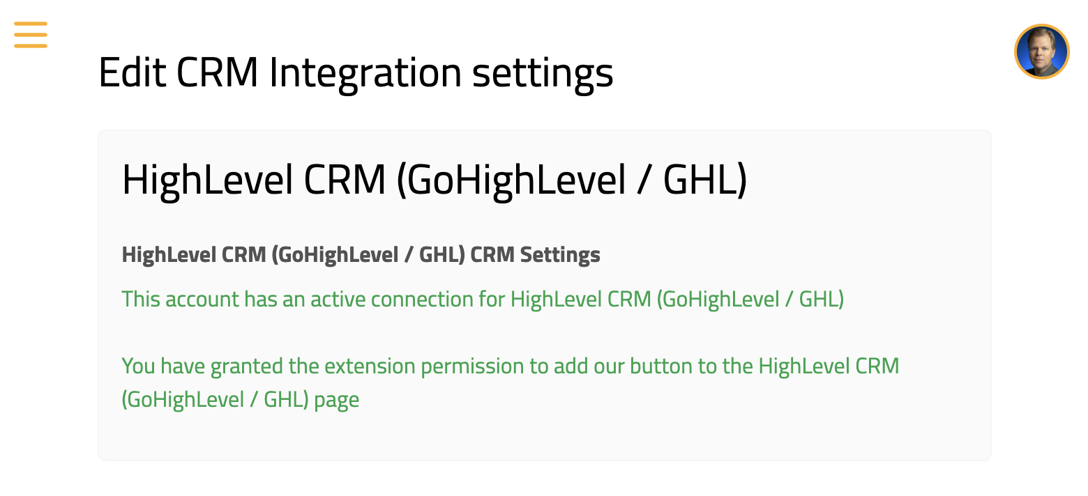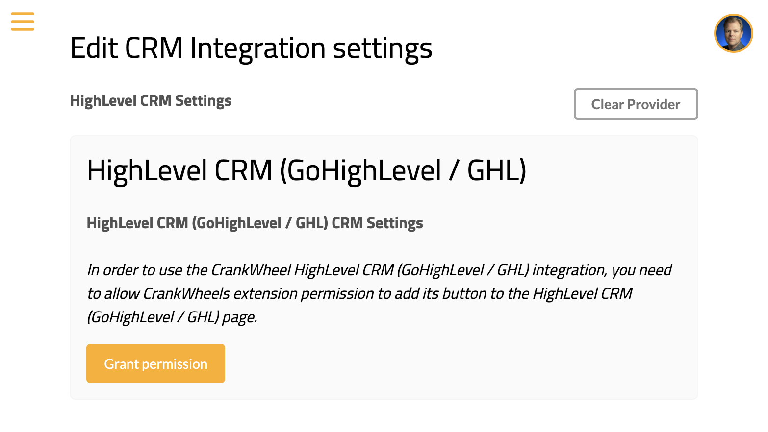 This page will show HighLevel CRM as the selected CRM integration. Please click the button labelled “Grant Permission”.
