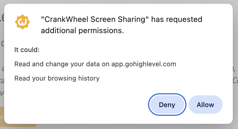 A dialog will open asking you if you want to allow the CrankWheel extension to read or edit pages on app.gohighlevel.com. Click Allow to enable the extension.