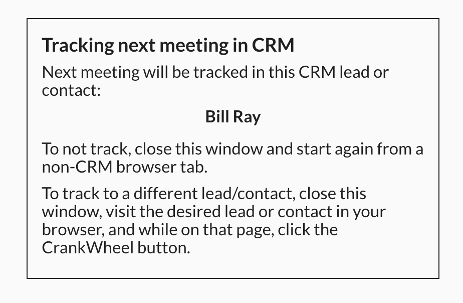 Clicking that button will launch the CrankWheel control panel. You will see a message indicating that the next meeting will be tracked to the contact you chose. When you start a meeting you will see that the fields for email and phone number will be pre-filled with the person’s contact details from HighLevel.
