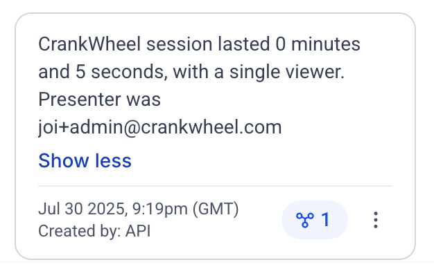 At the conclusion of your meeting, you will also see that the notes for the contact in HighLevel will contain an entry for the CrankWheel meeting, and a link to any recording made.