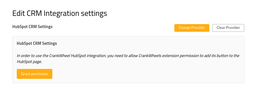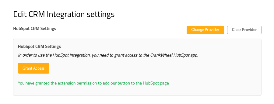 The HubSpot integration page in CrankWheel should now be showing that you have granted permission to the extension but you still need to log in to HubSpot to complete the connection. Click the “Grant Access” button.