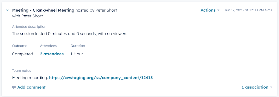 At the conclusion of your meeting, you will also see that the HubSpot contact timeline will contain an entry for the CrankWheel meeting, and a link to any recording made.