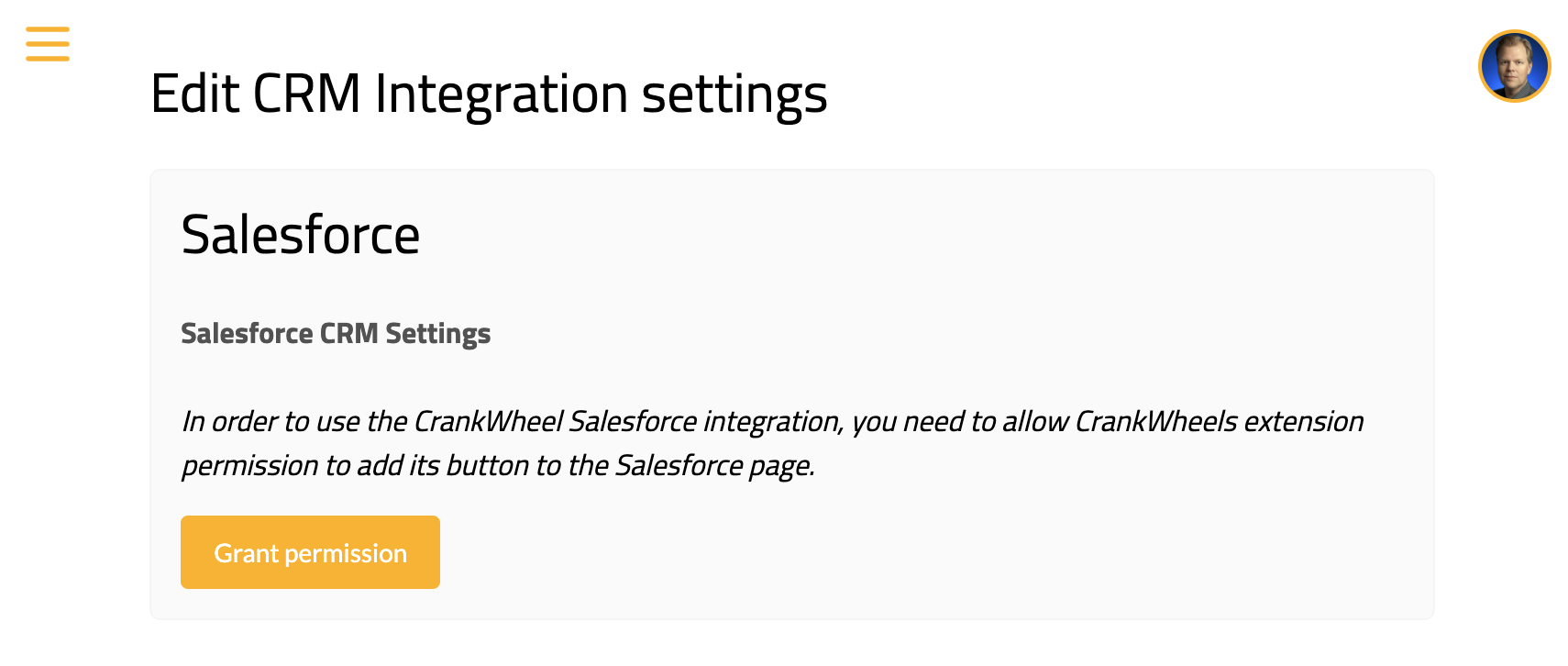 After your administrator has enabled the Salesforce integration, the next time you use CrankWheel, you will be prompted to visit the CrankWheel CRM integration page to complete CRM setup.