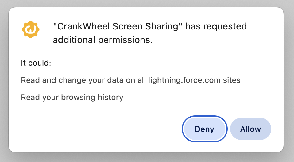 A dialog will open asking you if you want to allow the CrankWheel extension to read or edit pages on lightning.force.com. Click Allow to enable the extension.