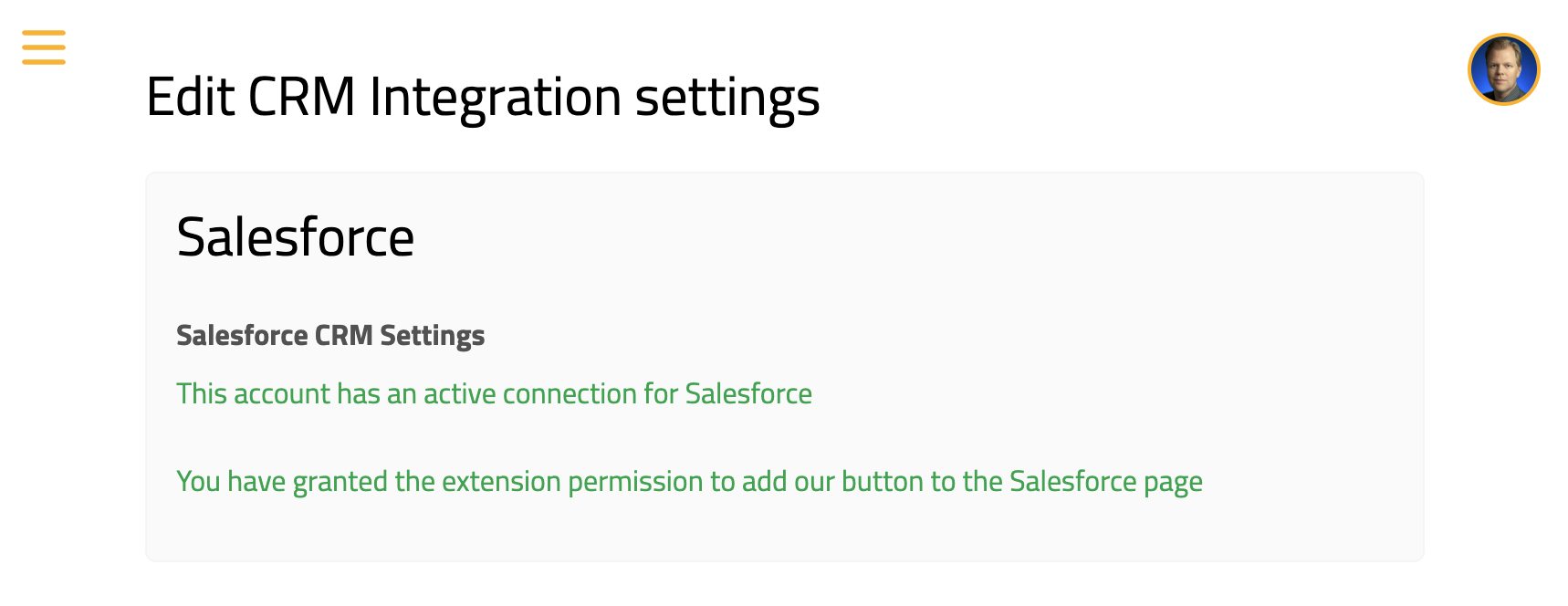 This page will show Salesforce as the selected CRM integration. Please click the button labelled “Grant Permission”.