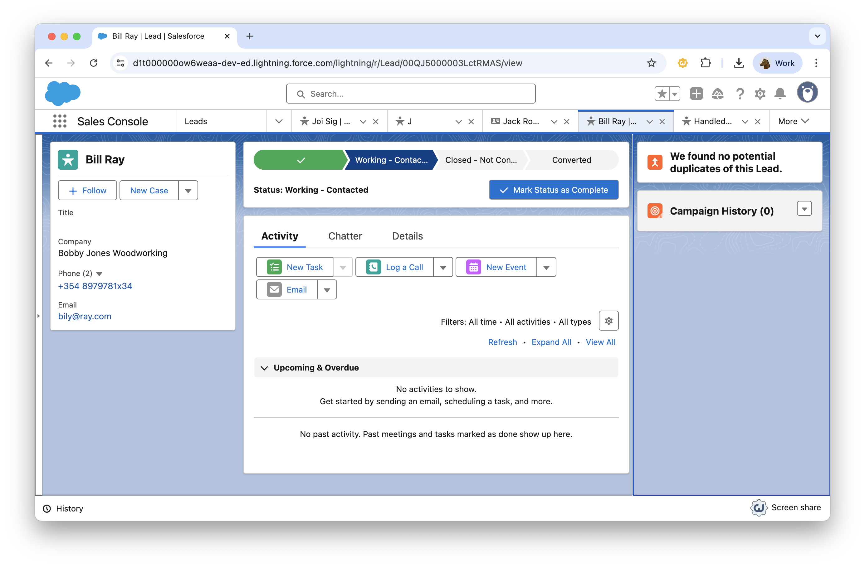 Open a Lead or a Contact in the Sales Console in Salesforce. You should see a CrankWheel button at the bottom-right of the Lead or Contact. You can click either this button, or the extension button (right hand side, a bit above the web page) to launch CrankWheel with this contact’s details.
