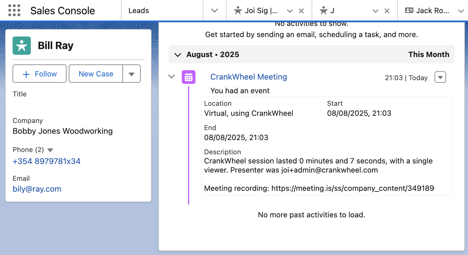 At the conclusion of your meeting, you will also see that the Salesforce contact timeline will contain an entry for the CrankWheel meeting, and a link to any recording made.