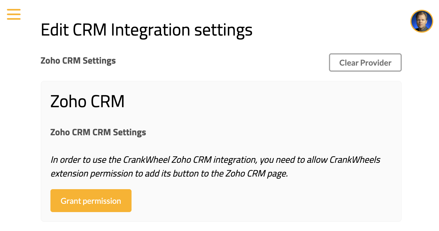 After your administrator has enabled the Zoho CRM integration, the next time you use CrankWheel, you will be prompted to visit the CrankWheel CRM integration page to complete CRM setup.