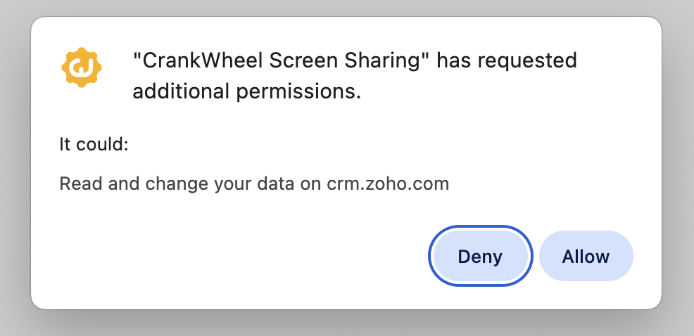 A dialog will open asking you if you want to allow the CrankWheel extension to read or edit pages on crm.zoho.com. Click Allow to enable the extension.
