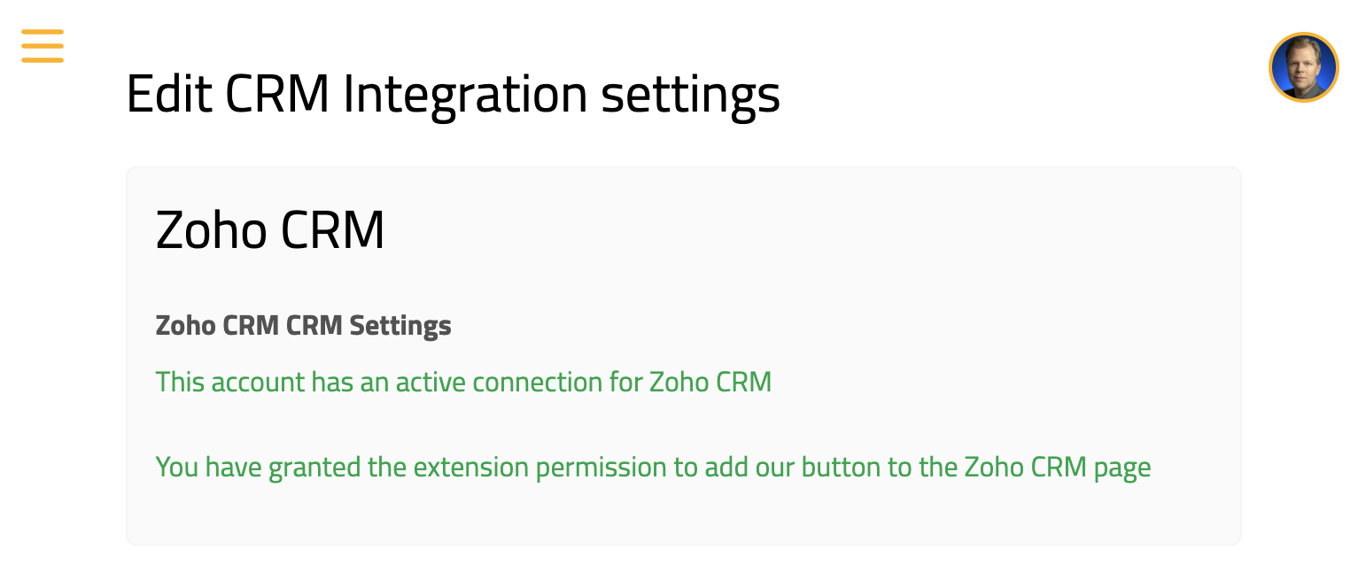 At this point, assuming your administrator already enabled the connection to Zoho CRM, the integration page should show as follows and you will be ready to start using the integration.