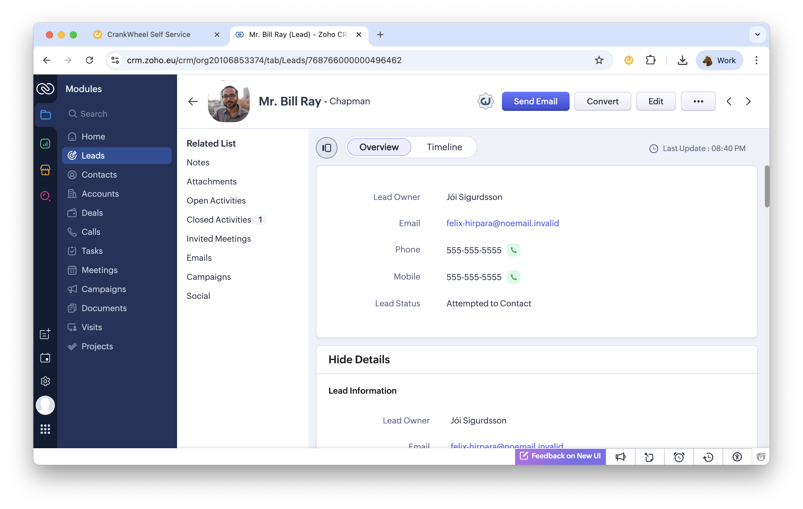 Open a Lead or a Contact in Zoho CRM. You should see a CrankWheel button in the actions header for the Lead or Contact (near the “Send Email” and “Convert” buttons). You can click either this button, or the extension button (right hand side, a bit above the web page) to launch CrankWheel with this contact’s details.