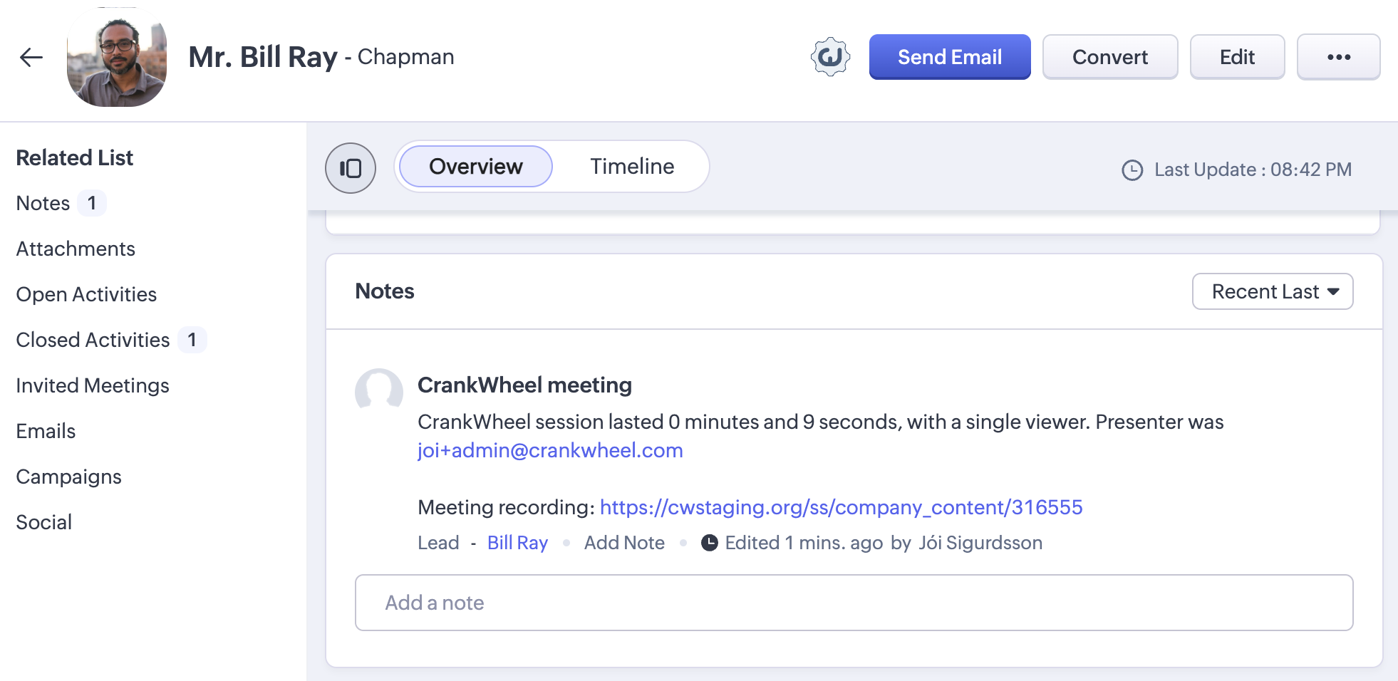 At the conclusion of your meeting, you will also see that the Zoho CRM contact timeline will contain an entry for the CrankWheel meeting, and a link to any recording made.