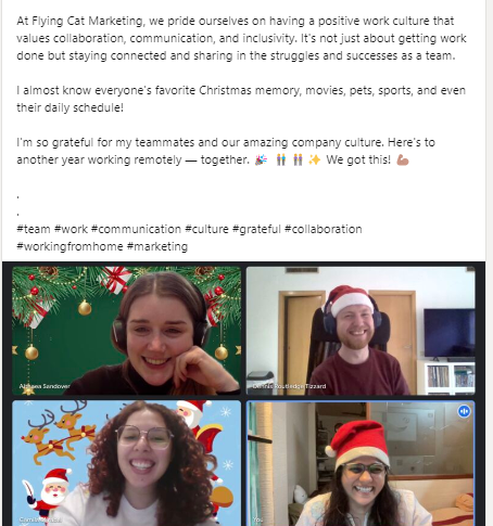 For example, Flying Cat Marketing’s team members work remotely yet they feel the most connected with each other even when they’re time zones apart.