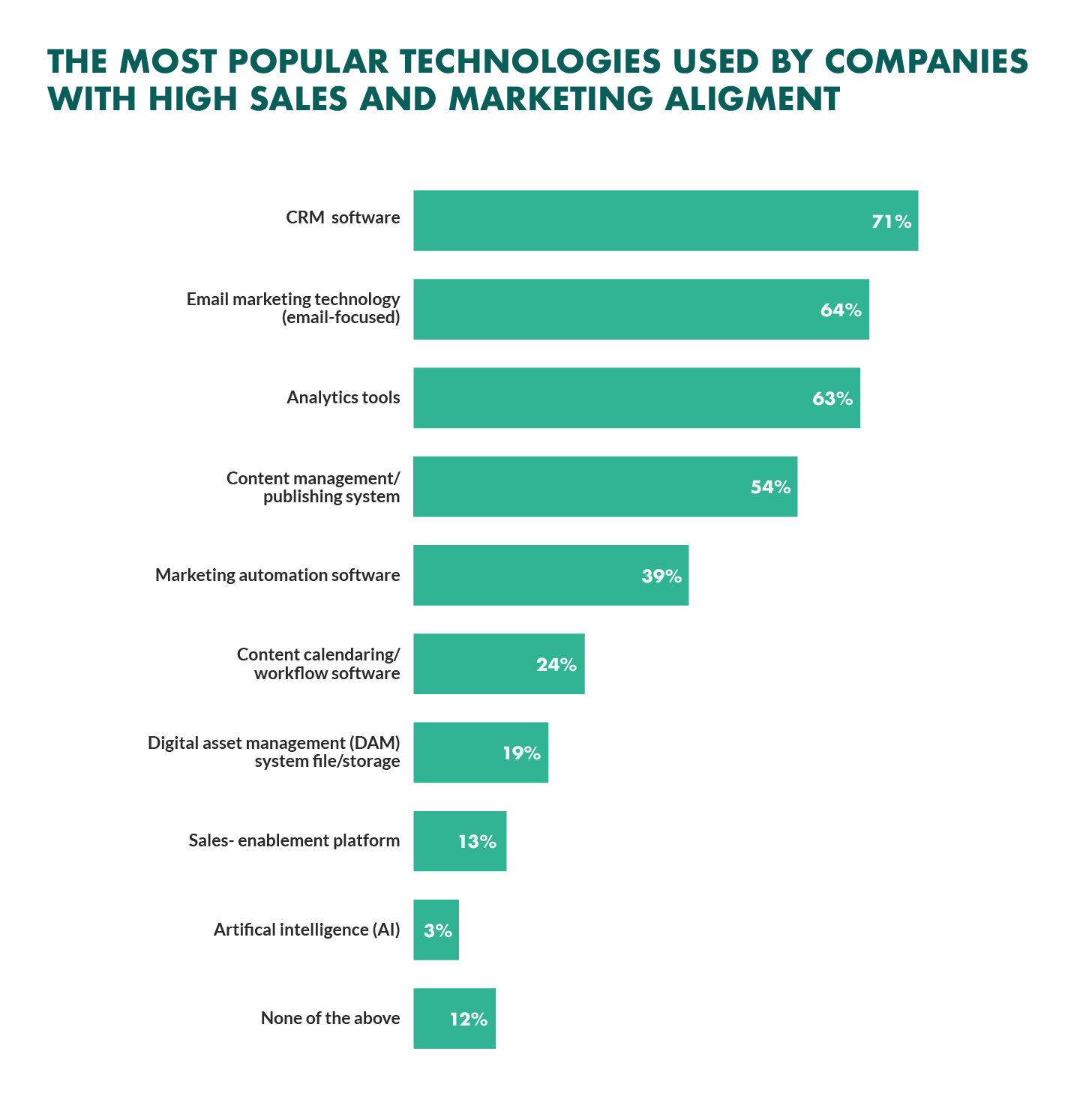 One of the most reliable technologies used by companies leveraging sales and marketing alignment is CRM, followed by email marketing, online scheduling, and marketing automation.