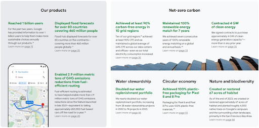 Google commits to run its data centers and offices using renewable energy. They set a goal to run a 24/7 carbon-free energy (CFE) by 2030. Every year they share reports to show their current sustainability strategy and summary of progress.