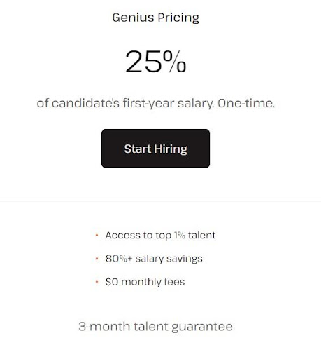Genius doesn’t have the hassle of upfront or monthly fees. They offer a one-time payment of 25% of your candidate’s first-year salary. If you don’t hire anyone, then you don’t have to pay for anything.