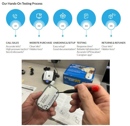 But infographics are also an excellent choice to summarize the key test results. Here’s a simple infographic example explaining the hands-on testing process of a review site for a medical alert system.