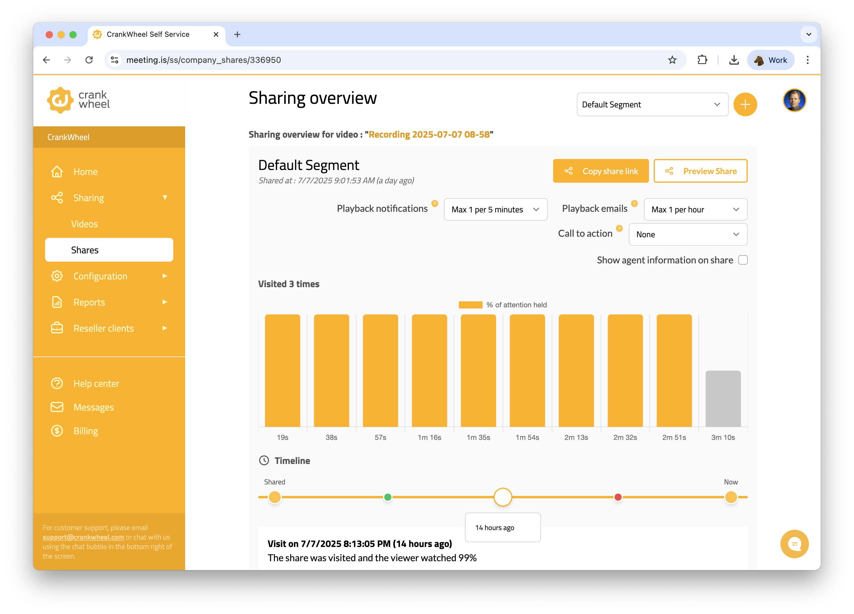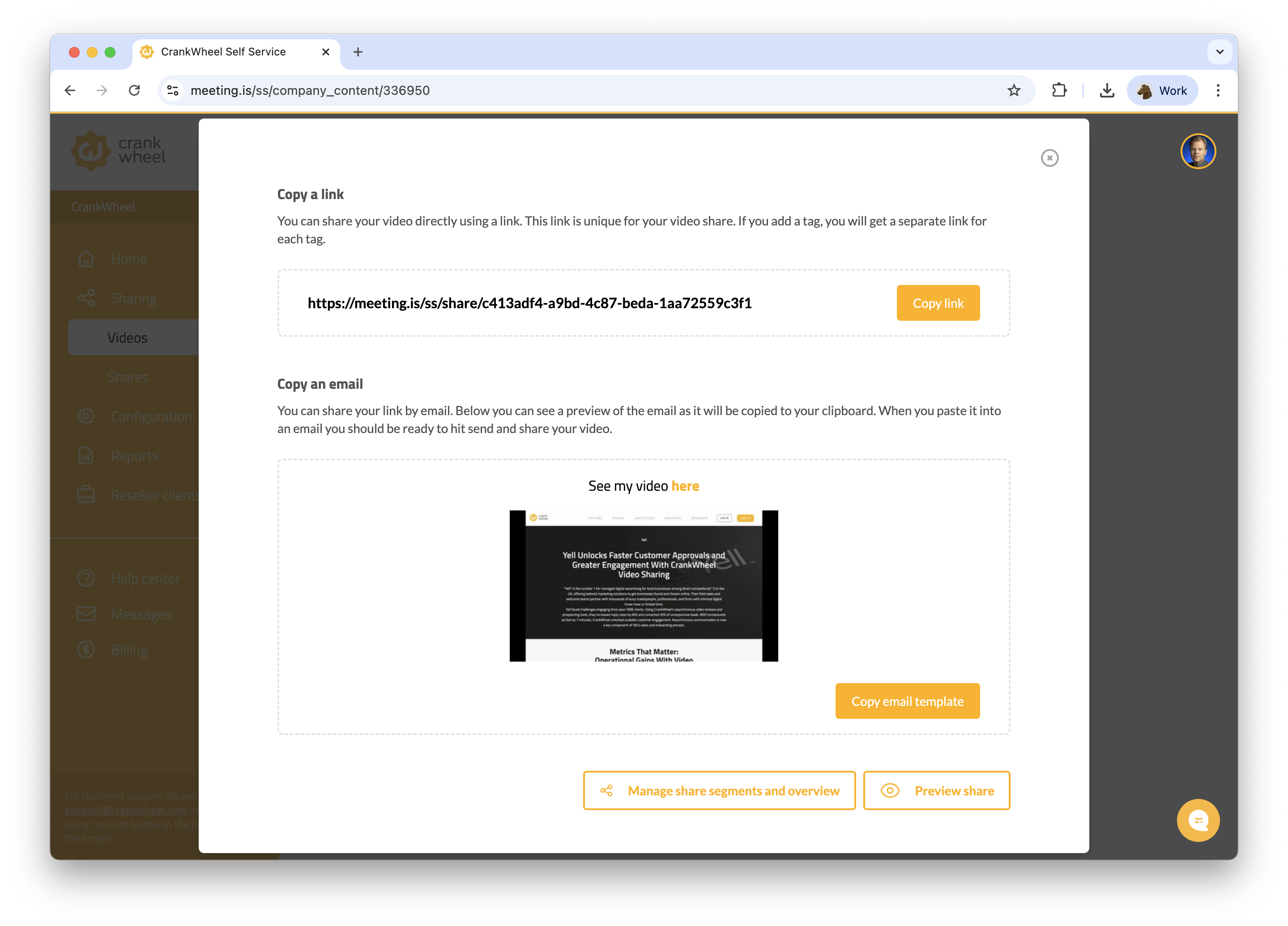 Instead of chasing live appointments, Yell onboarding agents now record CrankWheel video walkthroughs of completed websites and campaigns, then send a personalised link via email, WhatsApp, or Messenger. Customers open videos at their convenience—often on their phones in between jobs or after hours. On the sales side, account managers use CrankWheel prospecting videos to ‘wake up’ leads that have gone cold, or to initially pique their interest. These videos quickly demonstrate value and encourage prospects to respond, even after weeks of going silent. Playback notifications and engagement metrics allow sales agents to see which prospects are interested, and follow up with them at the most appropriate times. Recording a video in CrankWheel is as simple as starting a live screen share, which Yell teams had already mastered. With just one extra click, an agent can turn any walkthrough into a recording, tailor the messaging for a particular customer or prospect, and share it via their preferred communication channel, with an animated preview included when shared in supported mediums like email. The entire workflow mimics what agents already do, only now it’s asynchronous and massively scalable. Steph James recalls one early breakthrough: